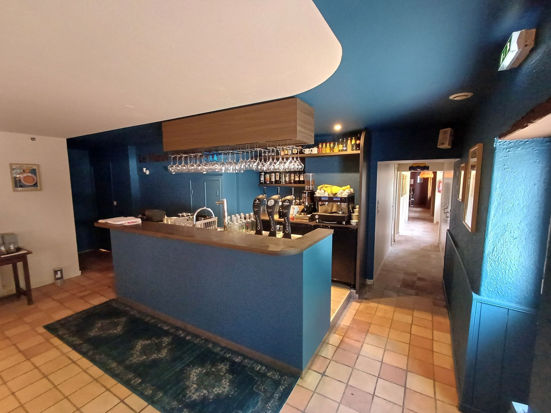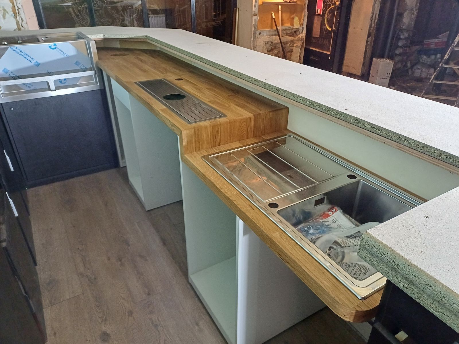 Bar en chêne massif huilé et back bar en panneau plaqué chêne.