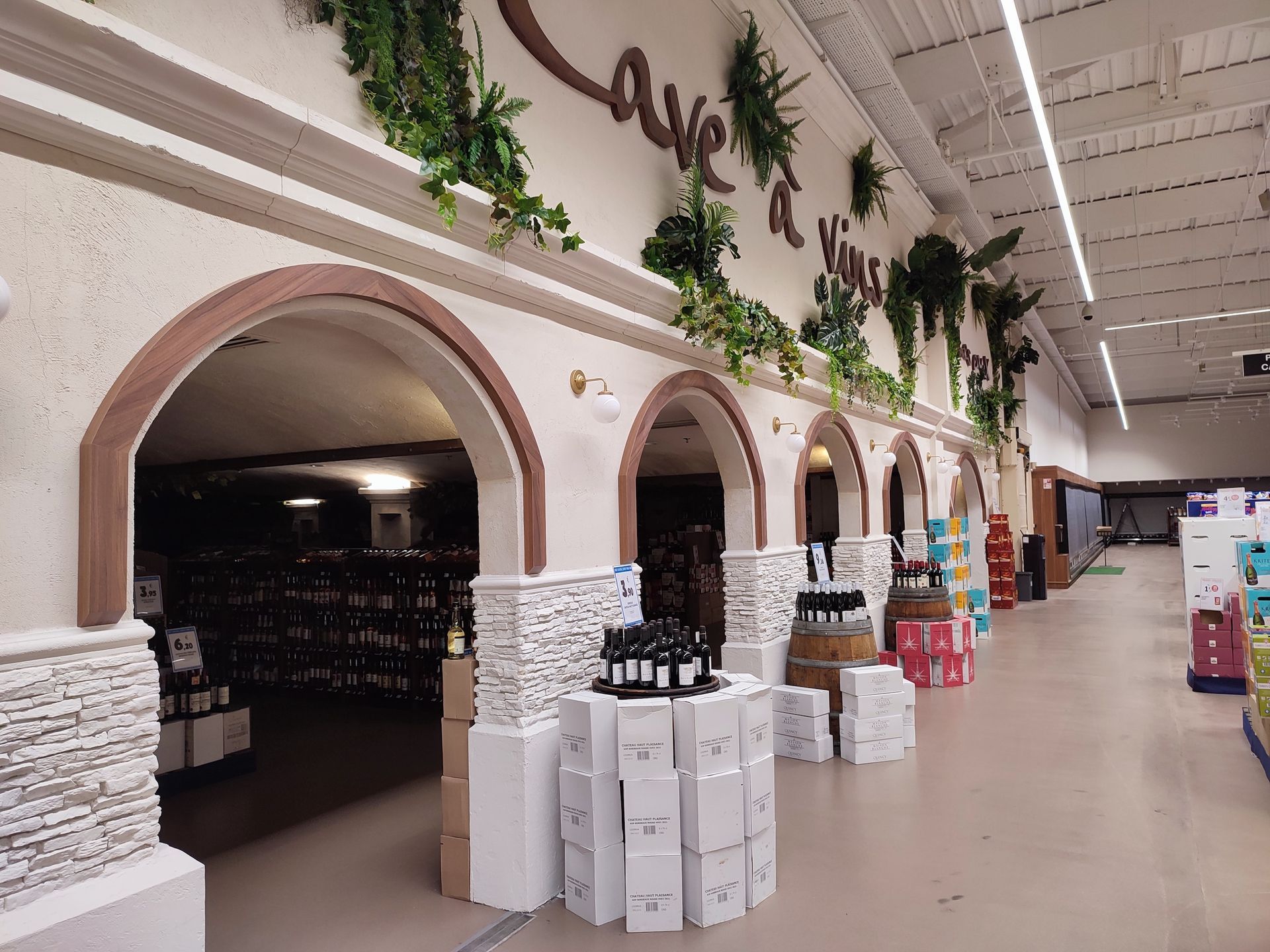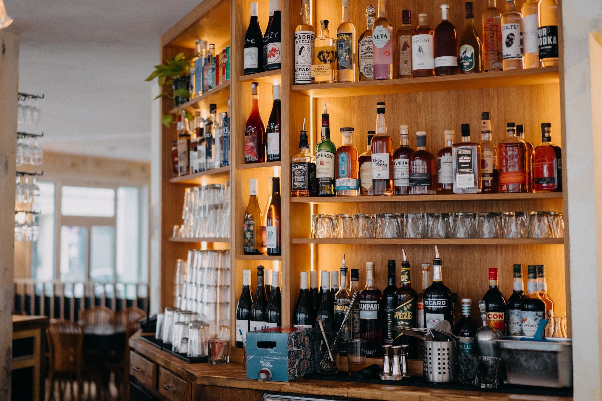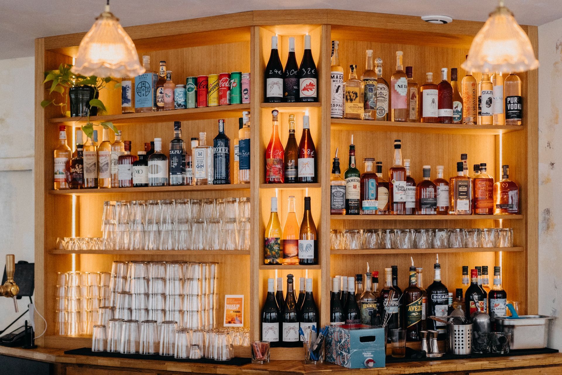 Back bar équipé d'étagère sur mesure, de rangement, de trois frigo et d'une joue de délimitation.