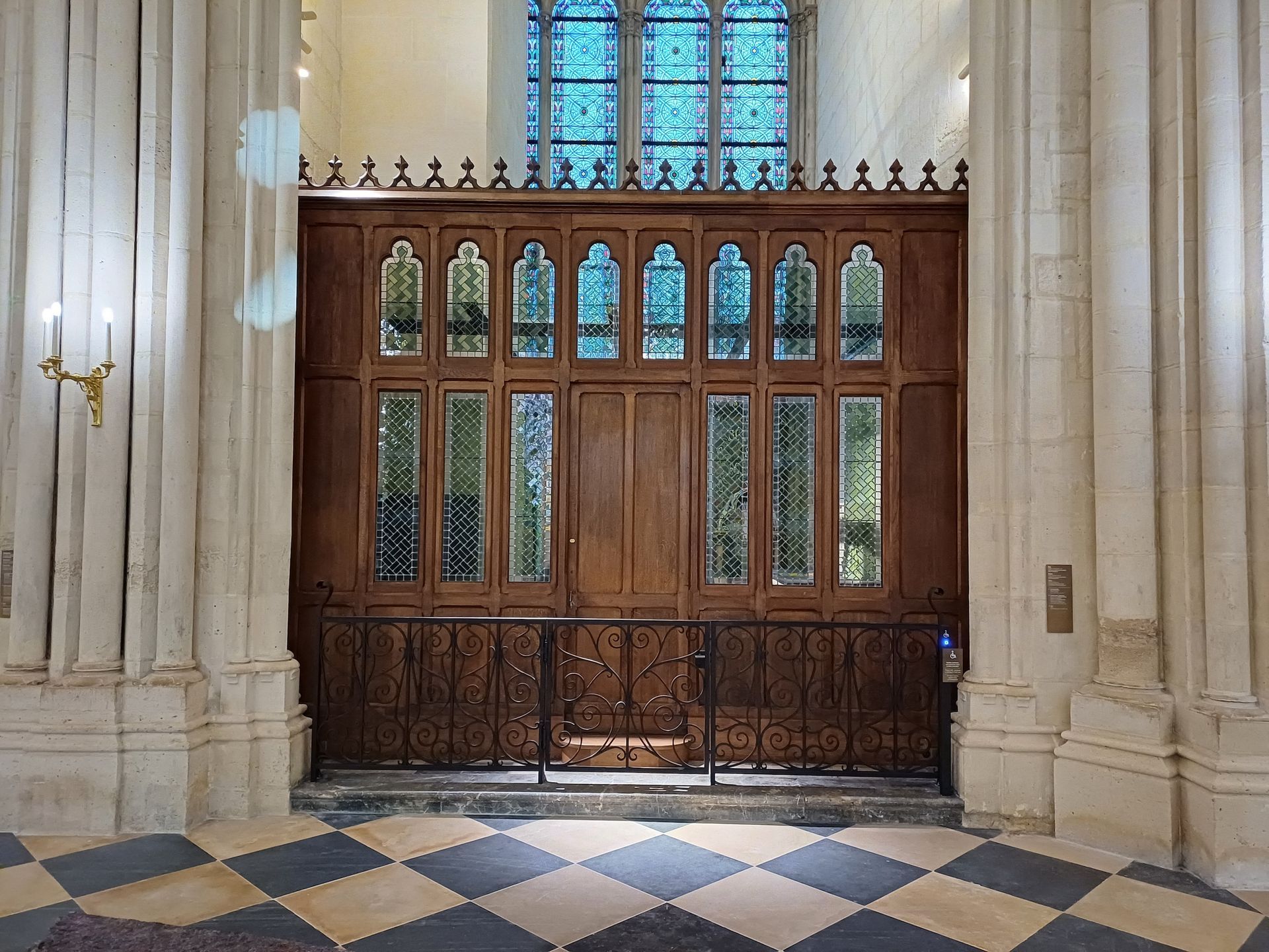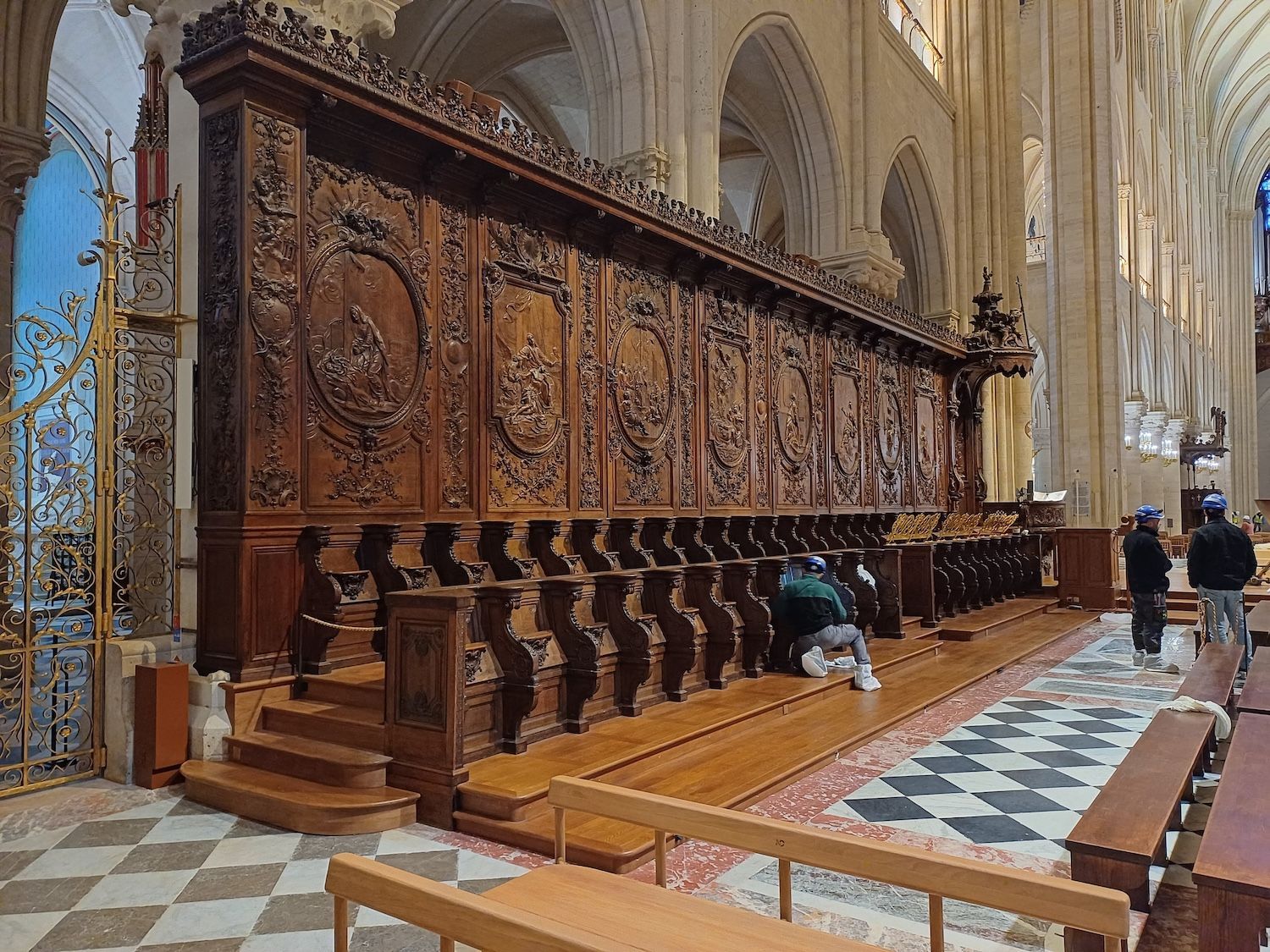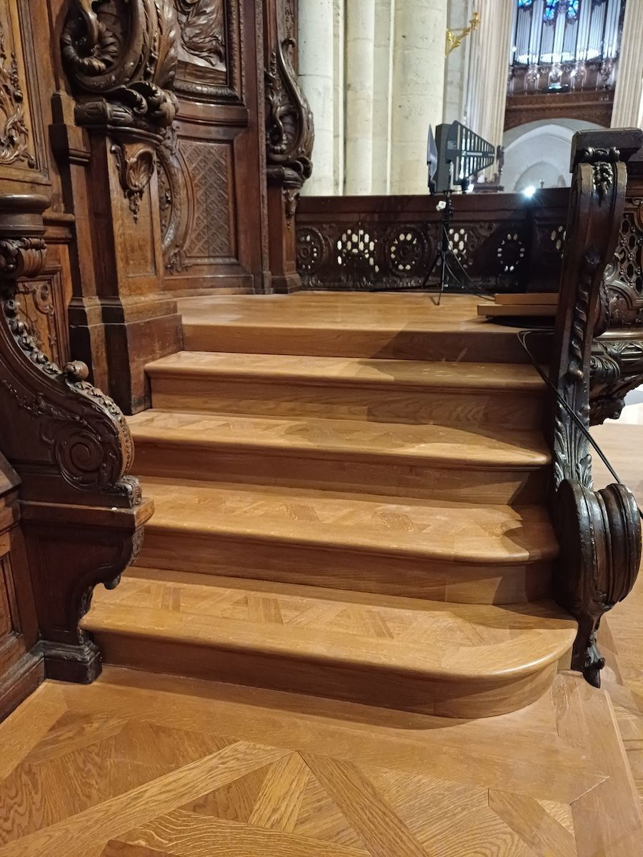 Escalier avec marche arrasée et cintrée dans les stalles de Notre Dame de Paris