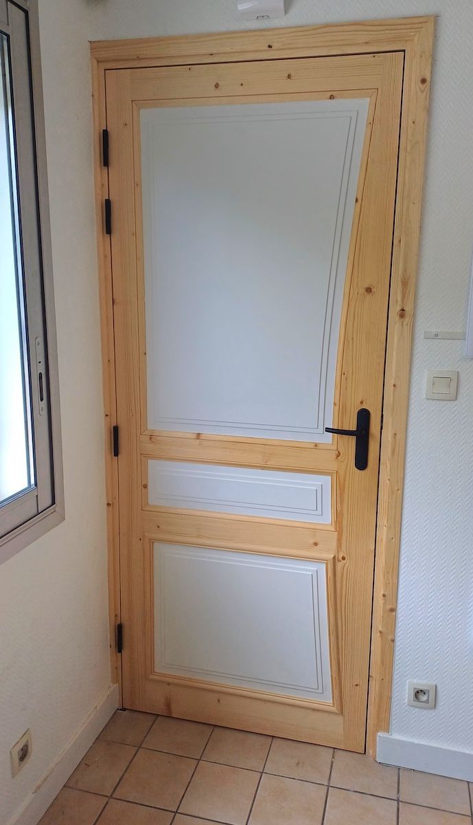 Porte intérieure avec panneau isolant. Porte en épicéa huilé et panneau mdf peint