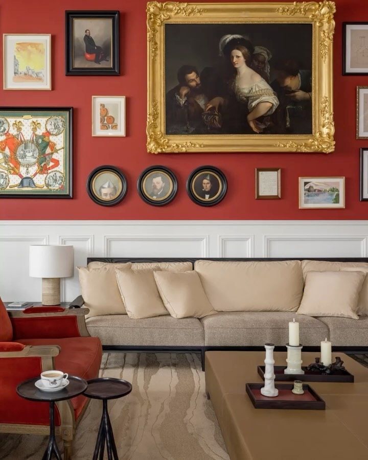 Porte intérieure avec chambranles, contre-chambranles, frontons et lambris bas